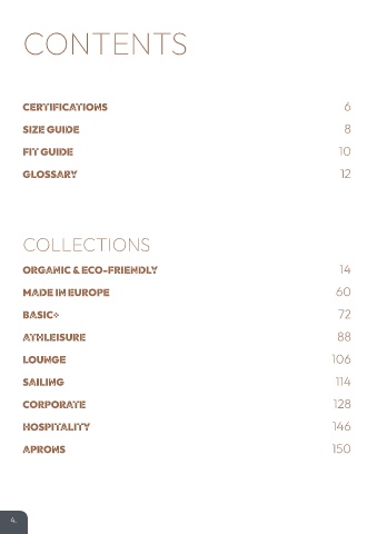 CONTENTS CERTIFICATIONS 6 SIZE GUIDE 8 FIT GUIDE 10 GLOSSARY 12 COLLECTIONS ORGANIC & ECO-FRIENDLY 14 MADE IN EUROPE 60 BASIC+ 72 ATHLEISURE 88 LOUNGE 106 SAILING 114 CORPORATE 128 HOSPITALITY 146 APRONS 150 4.