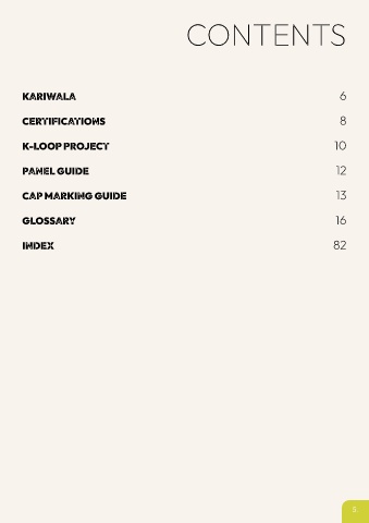 CONTENTS KARIWALA 6 CERTIFICATIONS 8 K-LOOP PROJECT 10 PANEL GUIDE 12 CAP MARKING GUIDE 13 GLOSSARY 16 INDEX 82 5.