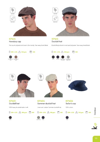Flat cap in polyester and wool. Ultra trendy. Tear-away brand label. Duckbill-style beret in wool and polyester. Tear-away brand label.