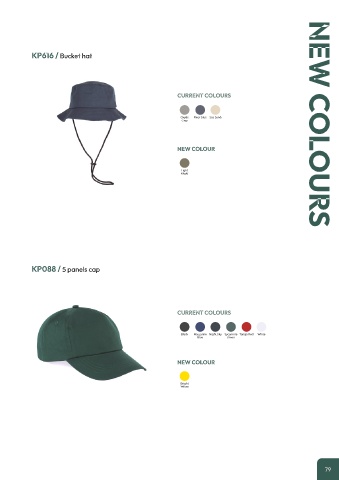 KP616 / Bucket hat CURRENT COLOURS Oxyde River blue Sea Sand Grey NEW COLOURS NEW COLOUR Light Khaki KP088 / 5 panels cap CURRENT COLOURS Black Mazzarine Night Sky Sycamore Tango Red White Blue Green NEW COLOUR Bright Yellow 79