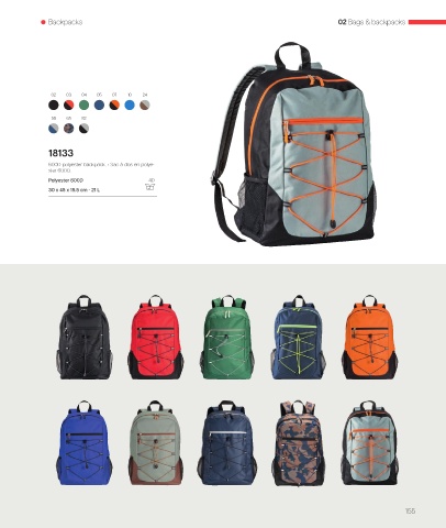Backpacks 02 Bags & backpacks 02 03 04 05 07 10 24 58 65 82 18133 600D polyester backpack. • Sac à dos en polye- ster 600D. Polyester 600D 40 30 x 45 x 15.5 cm - 21 L 155