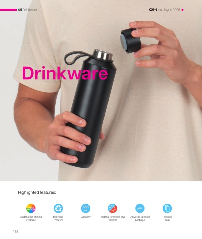 05 Drinkware catalogue 2025 Drinkware Highlighted features: Sublimation printing Recycled Capacity Thermal (24h cold and Delivered in single Foldable available material 12h hot) package item 288