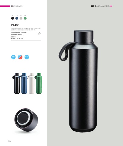 05 Drinkware catalogue 2025 02 05 22 64 24433 630 ml stainless steel thermal bottle • Bouteille isotherme en acier inoxydable de 630 ml Stainless steel, TPR (ther- 20 moplastic rubber) 630 ml ø 7 cm x (h) 25,7 cm 294