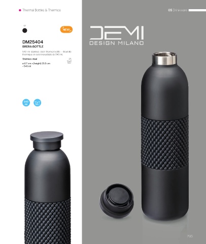 Thermal Bottles & Thermos 05 Drinkware 02 NEW DM25404 BRERA•BOTTLE 540 ml stainless steel thermal bottle. • Bouteille thermique en acier inoxydable de 540 ml. Stainless steel 25 ø 6.7 cm x (height) 25.5 cm - 540 ml 295