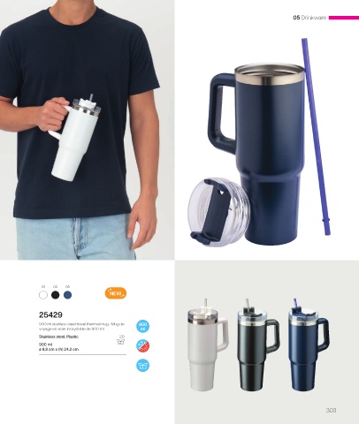 05 Drinkware 01 02 05 NEW 25429 900 ml stainless steel travel thermal mug • Mug de voyage en acier inoxydable de 900 ml Stainless steel, Plastic 20 900 ml ø 8,8 cm x (h) 24,2 cm 303