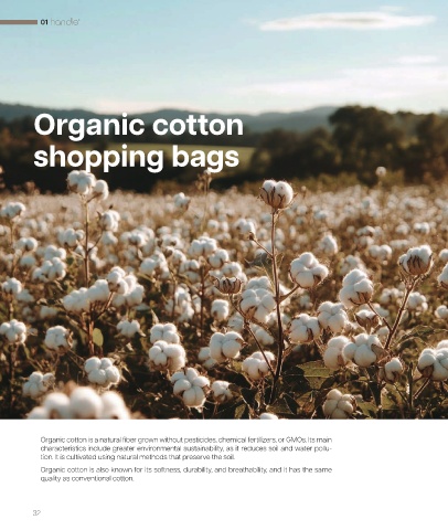 Organic cotton is a natural fiber grown without pesticides, chemical fertilizers, or GMOs. Its main