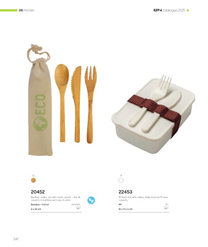 06 Kitchen catalogue 2025 22 01 20452 22453 Bamboo cutlery set with cotton pouch. • Set de PP lunch box with cutlery. • Boîte lunch en PP avec couverts en bambou avec sac en coton. couverts. Bamboo - Cotton 100/300 PP 50 6 x 22 cm 16 x 11 x 5 cm 342
