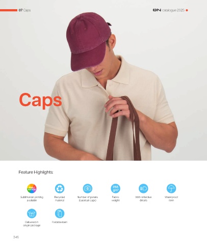 07 Caps catalogue 2025 Caps Feature Highlights: Sublimation printing Recycled Number of panels Fabric With reflective Waterproof available material (baseball caps) weight details item Delivered in Foldable item single package 346