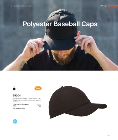 Polyester baseball caps 07 Caps Polyester Baseball Caps 02 NEW 25304 Polyamide and spandex, 6-panel baseball cap • Casquette de baseball en polyamide et spandex, 6 panneaux Polyamide (90%), Spandex 50/200 (10%) One size fits all adult 357
