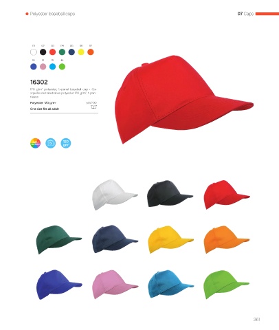 Polyester baseball caps 07 Caps 01 02 03 04 05 06 07 10 12 15 44 16302 120 g/m² polyester, 5-panel baseball cap • Ca- squette de baseball en polyester 120 g/m², 5 pan- neaux Polyester 120 g/m² 50/200 One size fits all adult 361