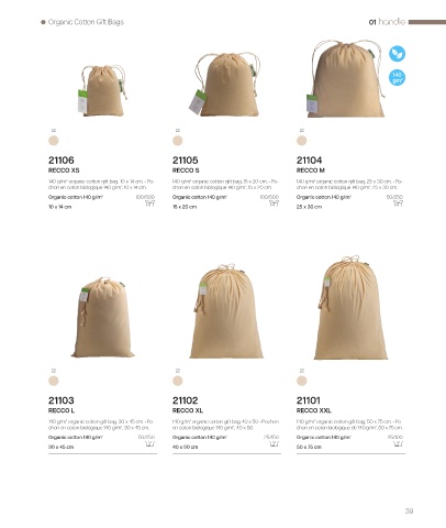 140 g/m² organic cotton gift bag, 10 x 14 cm. • Po- 140 g/m² organic cotton gift bag, 15 x 20 cm. • Po- 140 g/m² organic cotton gift bag, 25 x 30 cm. • Po-