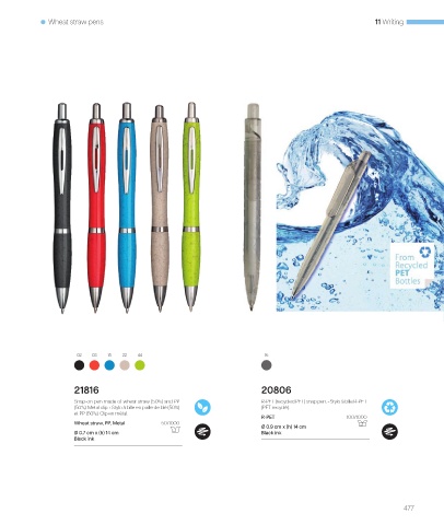 Snap-on pen made of wheat straw (50%) and PP R-PET (recycled PET) snap pen. • Stylo à bille R-PET