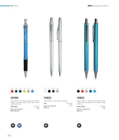 ABS snap-on pen. Metal clip and chrome-plated Plastic twist pen. • Stylo à bille en plastique. Plastic snap pen . Metal clip and chrome details.