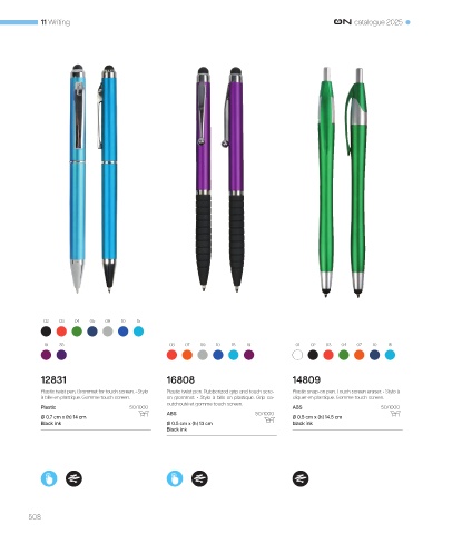 Plastic twist pen. Grommet for touch screen. • Stylo Plastic twist pen. Rubberized grip and touch scre- Plastic snap-on pen. Touch screen eraser. • Stylo à