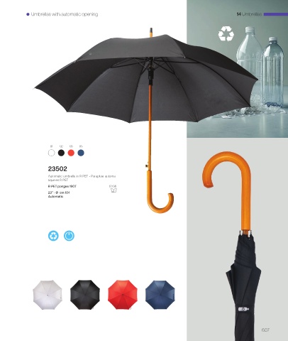 Umbrellas with automatic opening 14 Umbrellas 01 02 03 05 23502 Automatic umbrella in R-PET • Parapluie automa- tique en R-PET R-PET pongee 190T 12/36 23” - Ø cm 104 Automatic 607