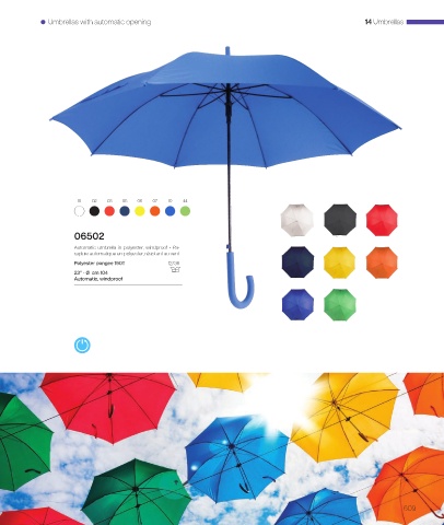Umbrellas with automatic opening 14 Umbrellas 01 02 03 05 06 07 10 44 06502 Automatic umbrella in polyester, windproof • Pa- rapluie automatique en polyester, résistant au vent Polyester pongee 190T 12/36 23” - Ø cm 104 Automatic, windproof 609