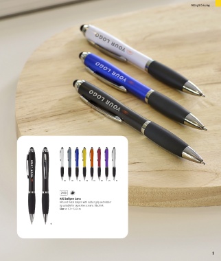 Writing & Colouring 02 03 05 06 07 08 24 32 2430 ABS ballpen Lana ABS and metal ballpen with rubber grip and rubber tip suitable for capacitive screens. Black ink. Size: ⌀ 1,3 × 13,3 cm 01 8 9