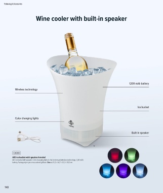 ABS ice bucket with speaker. Color-changing lights in the bottom and wireless technology. 1200 mAh