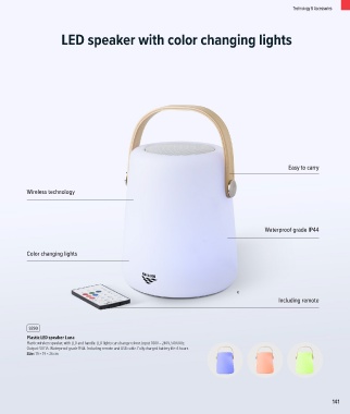 Plastic wireless speaker, with LED and handle. LED lights can change colour. Input 100V – 240V, 50/60Hz.