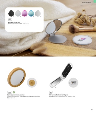 Bamboo single pocket mirror. Individually packaged in a brown cardboard box. Foldable plastic hair brush with mirror. Size: 20,8 × 4 × 2,4 cm