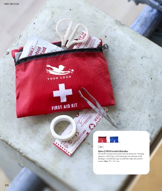 First aid kit in a nylon pouch with a belt clip attachment. Including: