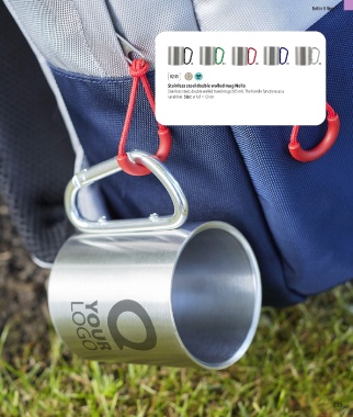Bottles & Mugs 01 04 08 23 32 8245 185 Stainless steel double walled mug Nella Stainless steel, double walled travel mug (185 ml). The handle functions as a carabiner. Size: ⌀ 6,8 × 7,9 cm 32 32 250 200 32 32 350 220 234 235