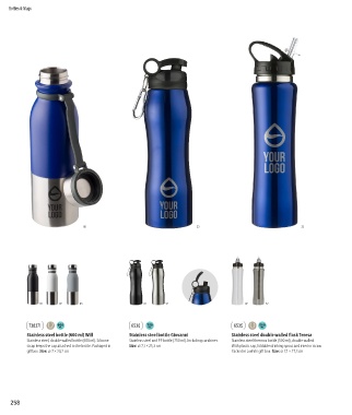 Stainless steel, double walled bottle (600 ml). Silicone Stainless steel and PP bottle (750 ml). Including carabiner. Stainless steel thermos bottle (500 ml), double walled.