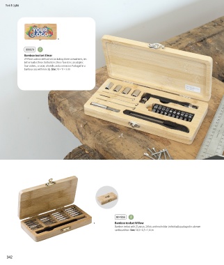 Bamboo toolset with 25 pieces. 24 bits and one holder. Individually packaged in a brown