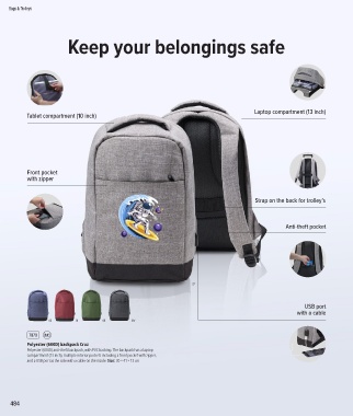 Polyester (600D) anti-theft backpack, with PVC backing. The backpack has a laptop