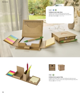 Cardboard cube with lid. Folds out to be a pen holder with small sticky notes in