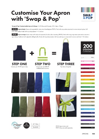 apron body, Neckband with adjustable sliding buckle, Made with recycled polyester, Self coloured caps on press studs for colour continuity 20 colours