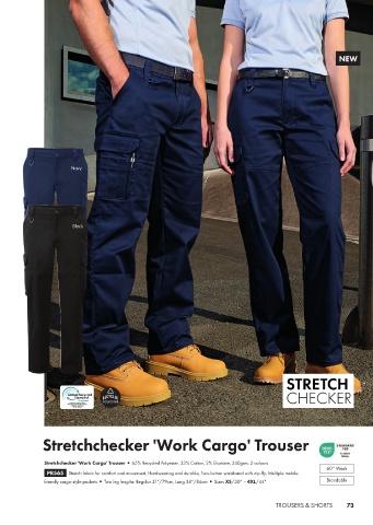 Stretchchecker 'Adapt' Trouser 95% Nylon, 5% Elastane, 170gsm, 2 colours Stretchchecker 'Work Cargo' Trouser 65% Recycled Polyester, 33% Cotton, 2% Elastane, 240gsm, 2 colours