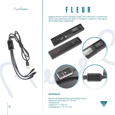 Elegant Pierre Cardin charging cable. The cable has 3 connectors: An elegant swivel USB flash drive Pierre Cardin with a capacity of 32 GB