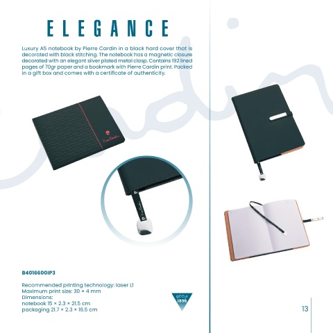 Luxurious Pierre Cardin folder is made of polyurethane with a magnetic Luxury A5 notebook by Pierre Cardin in a black hard cover that is