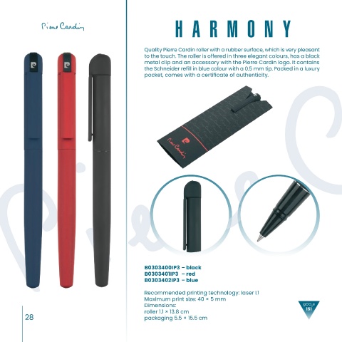 metal clip and an accessory with the Pierre Cardin logo. It contains refill with a 1 mm tip. Packed in a luxury pocket, comes with a certificate