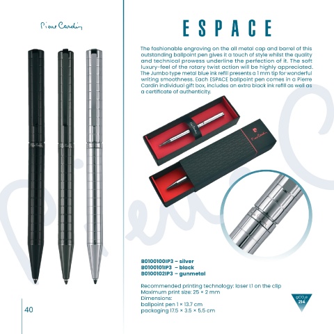writing smoothness. Each ESPACE ballpoint pen comes in a Pierre ballpoint pen comes in a gift box together with an extra black ink