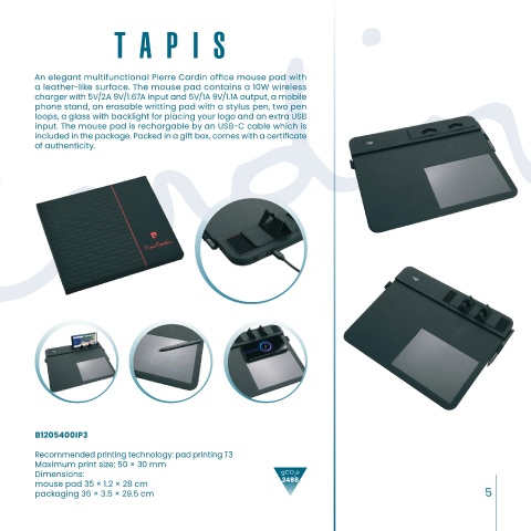 Elegant Pierre Cardin phone stand with 15W wireless charging function. An elegant multifunctional Pierre Cardin office mouse pad with