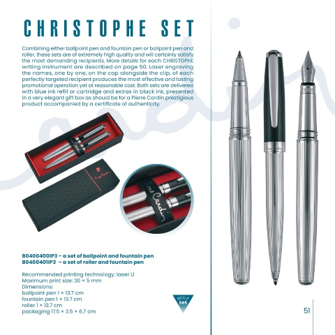 The black lacquered cap is ideal to take permanent laser engraved the most demanding recipients. More details for each CHRISTOPHE