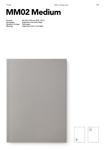 Prodir Take the long road. 130 MM02 Medium Format: A5 148 × 210 mm (5,8” × 8,3”) Booktype: Softcover with extra flaps Number of page: 160 pages Binding: Signature stitch in hot glue A B