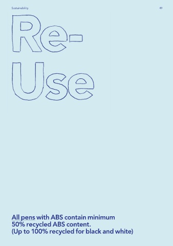Sustainability 49 All pens with ABS contain minimum 50% recycled ABS content. (Up to 100% recycled for black and white)