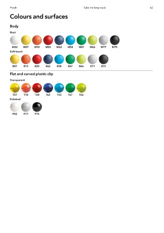 Prodir Take the long road. 62 Colours and surfaces Body Matt M02 M07 M10 M20 M62 M58 M67 M66 M77 M75 Soft touch R07 R10 R20 R62 R58 R67 R66 R77 R75 Flat and curved plastic clip Transparent T07 T10 T20 T62 T53 T67 T66 Polished P02 P77 P75