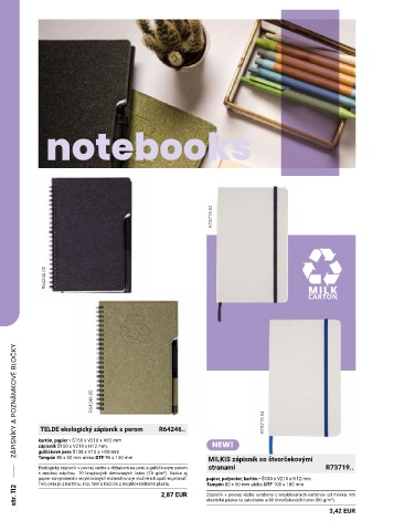 str. 112 2,87 EUR Zápisník v pevnej väzbe vyrobený z recyklovaných kartónov od mlieka. Má