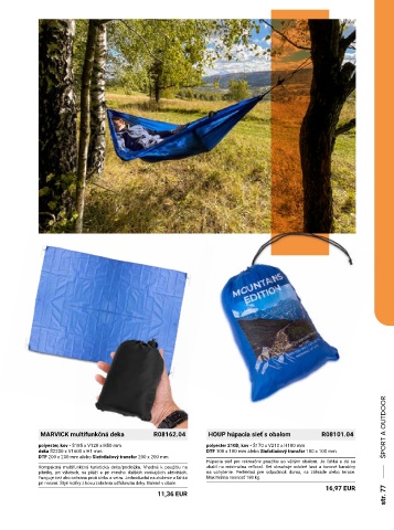 Kompaktná multifunkčná turistická deka/podložka. Vhodná k použitiu na zbaliť na minimálnu veľkosť. Set obsahuje odolné laná a kovové karabíny