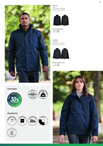 41 TRA361 Men ’s Sizes S-4XL (EU 48-64) Quantity per carton 8 1. 2. Men’s Colourways 1. Navy 540 2. Black 800 TRA362 Women’s Sizes 8-20 (EU 34-46) Quantity per carton 8 1. 2. Women’s Colourways 1. Navy 540 2. Black 800 FEATURES BRANDING