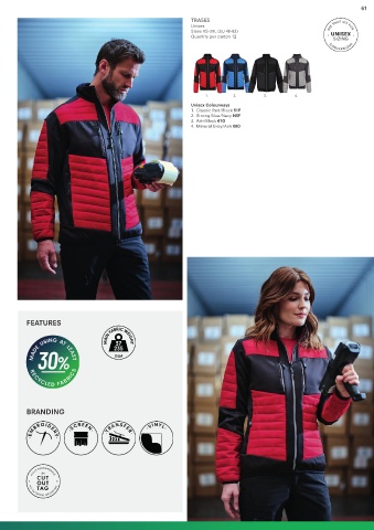 61 TRA563 Unisex Sizes XS-3XL (EU 46-62) Quantity per carton 12 1. 2. 3. 4. Unisex Colourways 1. Classic Red/Black 51P 2. Strong Blue/Navy N5F 3. Ash/Black 61G 4. Mineral Grey/Ash 00G FEATURES BRANDING