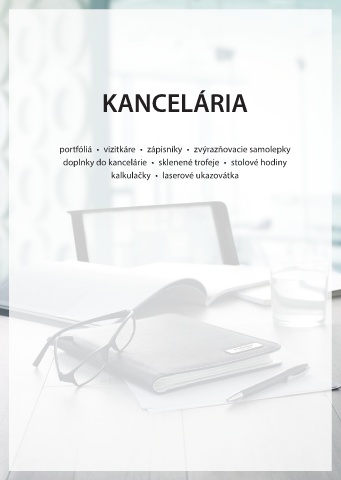 KANCELÁRIA portfóliá • vizitkáre • zápisníky • zvýrazňovacie samolepky doplnky do kancelárie • sklenené trofeje • stolové hodiny kalkulačky • laserové ukazovátka