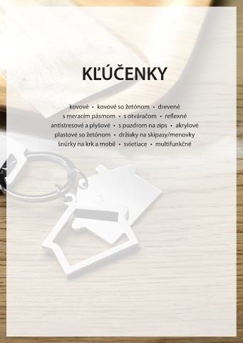 KĽÚČENKY kovové • kovové so žetónom • drevené s meracím pásmom • s otváračom • reflexné antistresové a plyšové • s puzdrom na zips • akrylové plastové so žetónom • držiaky na skipasy/menovky šnúrky na krk a mobil • svietiace • multifunkčné