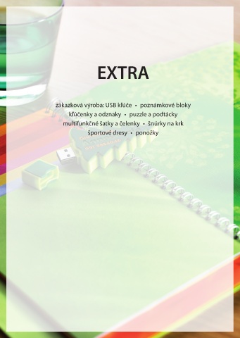 EXTRA EXTRA zákazková výroba: USB kľúče • poznámkové bloky kľúčenky a odznaky • puzzle a podtácky multifunkčné šatky a čelenky • šnúrky na krk športové dresy • ponožky