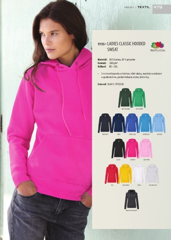 a spodnom leme, predné klokanie vrecko, bočné švy.
