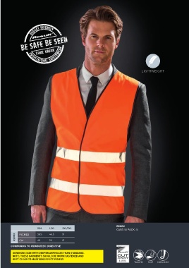 GENEROUS SIZE WITH DEEPER ARMHOLES THAN STANDARD. Bande de sécurité de 50mm piquée | Bords gansés en polyester gris | Bande auto-agrippante à l’avant pour plus de facilité